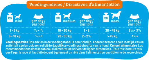 Le conseil figurant dans le tableau d’alimentation et le calculateur est donné à titre indicatif. D’autres facteurs tels que la race, l’exercice et le sexe jouent également un rôle dans les besoins alimentaires quotidiens de votre animal. Surveillez votre animal et adaptez la quantité si nécessaire. Veillez à ce que votre animal ait toujours un bol d’eau fraîche à sa disposition. Nous recommandons de servir les aliments à votre animal avant la date de péremption indiquée. Refermez soigneusement l’emballage après ouverture et conservez toujours l’alimentation dans un endroit frais et sec.