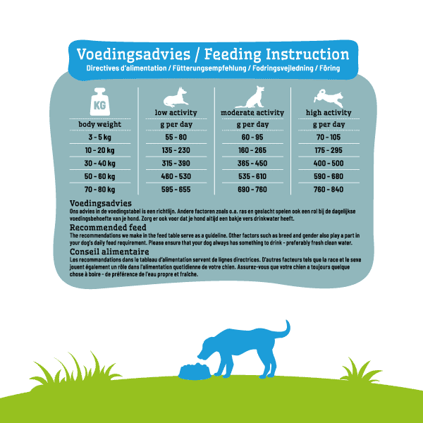 Le conseil figurant dans le tableau d’alimentation et le calculateur est donné à titre indicatif. D’autres facteurs tels que la race, l’exercice et le sexe jouent également un rôle dans les besoins alimentaires quotidiens de votre animal. Surveillez votre animal et adaptez la quantité si nécessaire. Veillez à ce que votre animal ait toujours un bol d’eau fraîche à sa disposition. Nous recommandons de servir les aliments à votre animal avant la date de péremption indiquée. Refermez soigneusement l’emballage après ouverture et conservez toujours l’alimentation dans un endroit frais et sec.