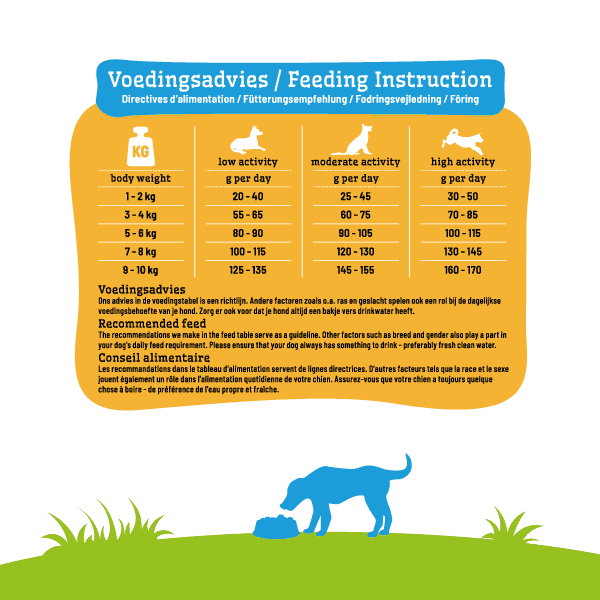 Ons advies in de voedingstabel en calculator is een richtlijn. Andere factoren zoals o.a. ras, beweging en geslacht spelen ook een rol bij de dagelijkse voedingsbehoefte van je dier. Blijf naar je dier kijken en pas de hoeveelheid aan wanneer nodig. Zorg er ook voor dat je dier altijd een bakje vers drinkwater heeft. Wij adviseren om de voeding voor de aangegeven houdbaarheidsdatum aan je dier te serveren. Sluit de verpakking na openen weer zorgvuldig af en bewaar de voeding altijd op een koele en droge plaats.