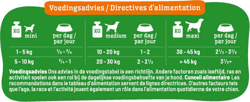 Ons advies in de voedingstabel en calculator is een richtlijn. Andere factoren zoals o.a. ras, beweging en geslacht spelen ook een rol bij de dagelijkse voedingsbehoefte van je dier. Blijf naar je dier kijken en pas de hoeveelheid aan wanneer nodig. Zorg er ook voor dat je dier altijd een bakje vers drinkwater heeft. Wij adviseren om de voeding voor de aangegeven houdbaarheidsdatum aan je dier te serveren. Sluit de verpakking na openen weer zorgvuldig af en bewaar de voeding altijd op een koele en droge plaats.